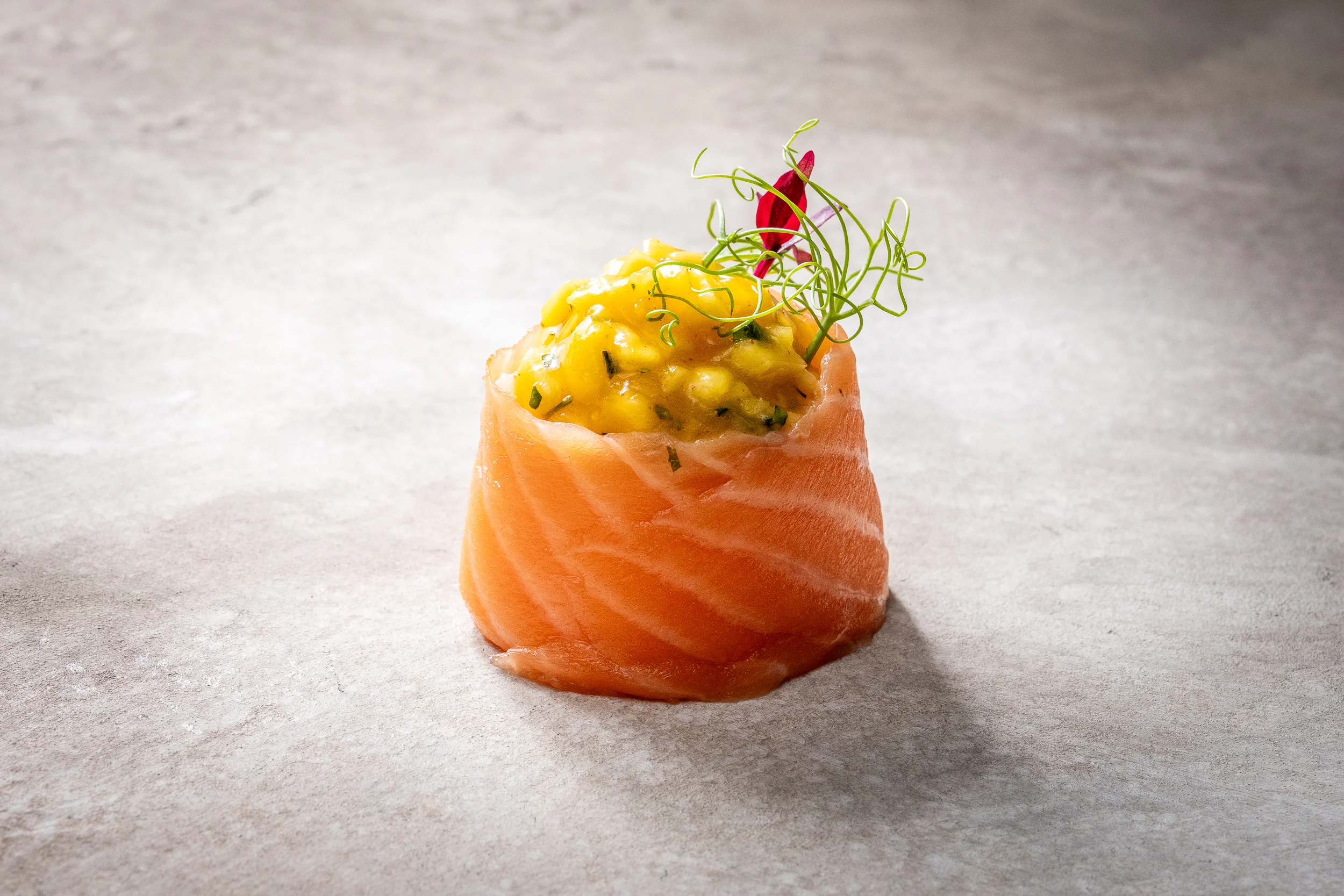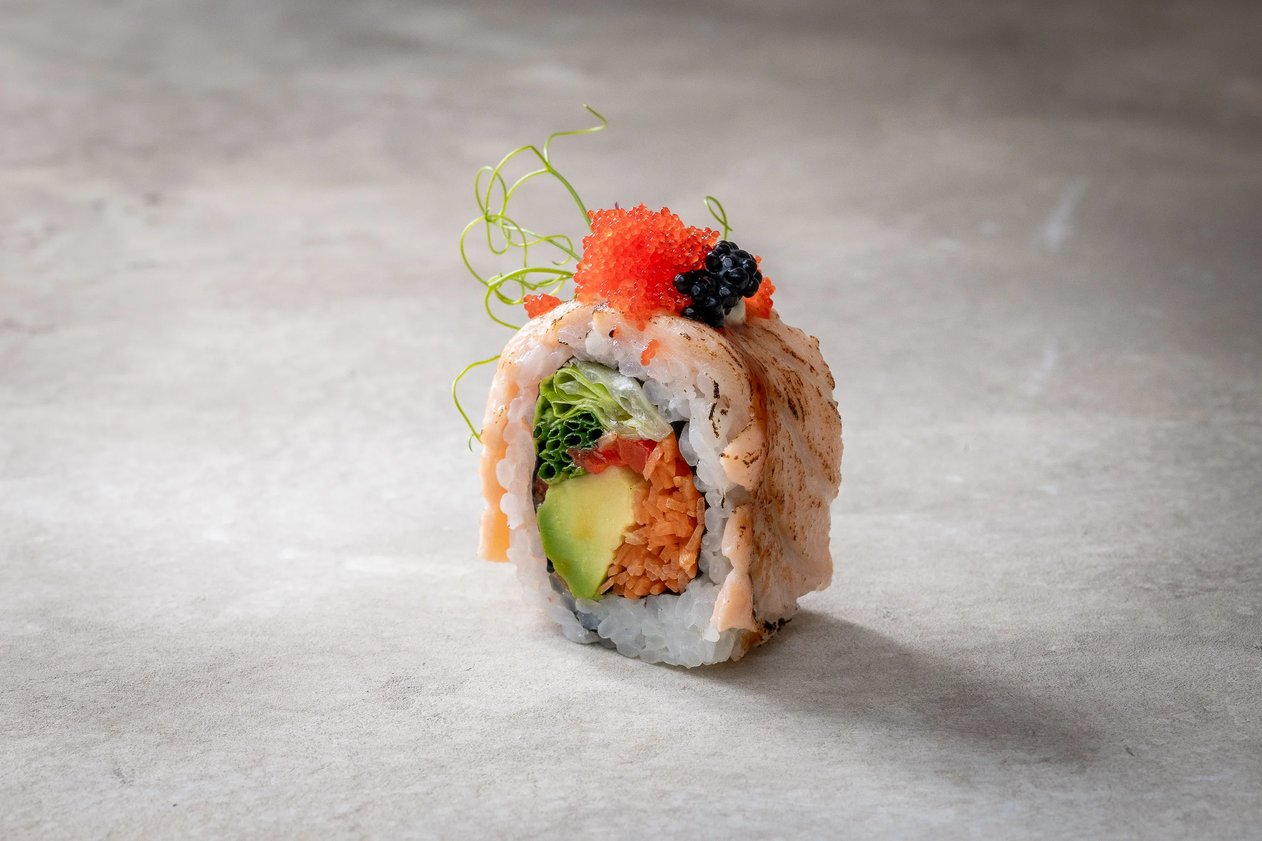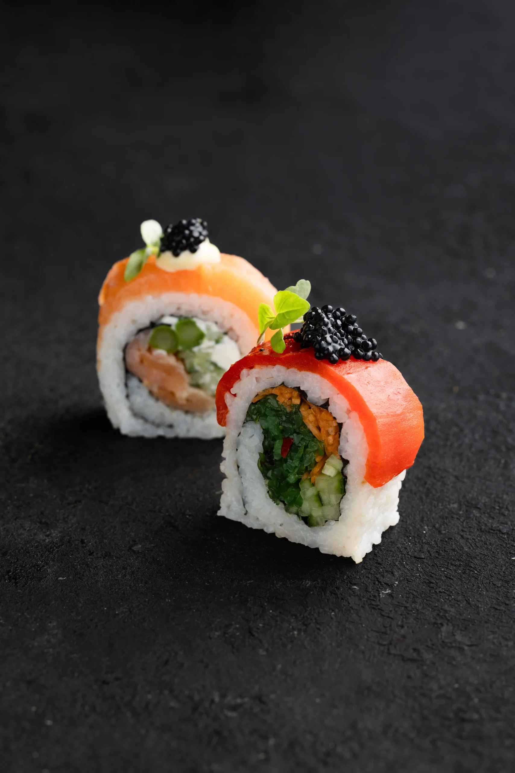 Salmon, smoked salmon, cream cheese, cucumber, asparagus, Japanese mayo, truffle caviar