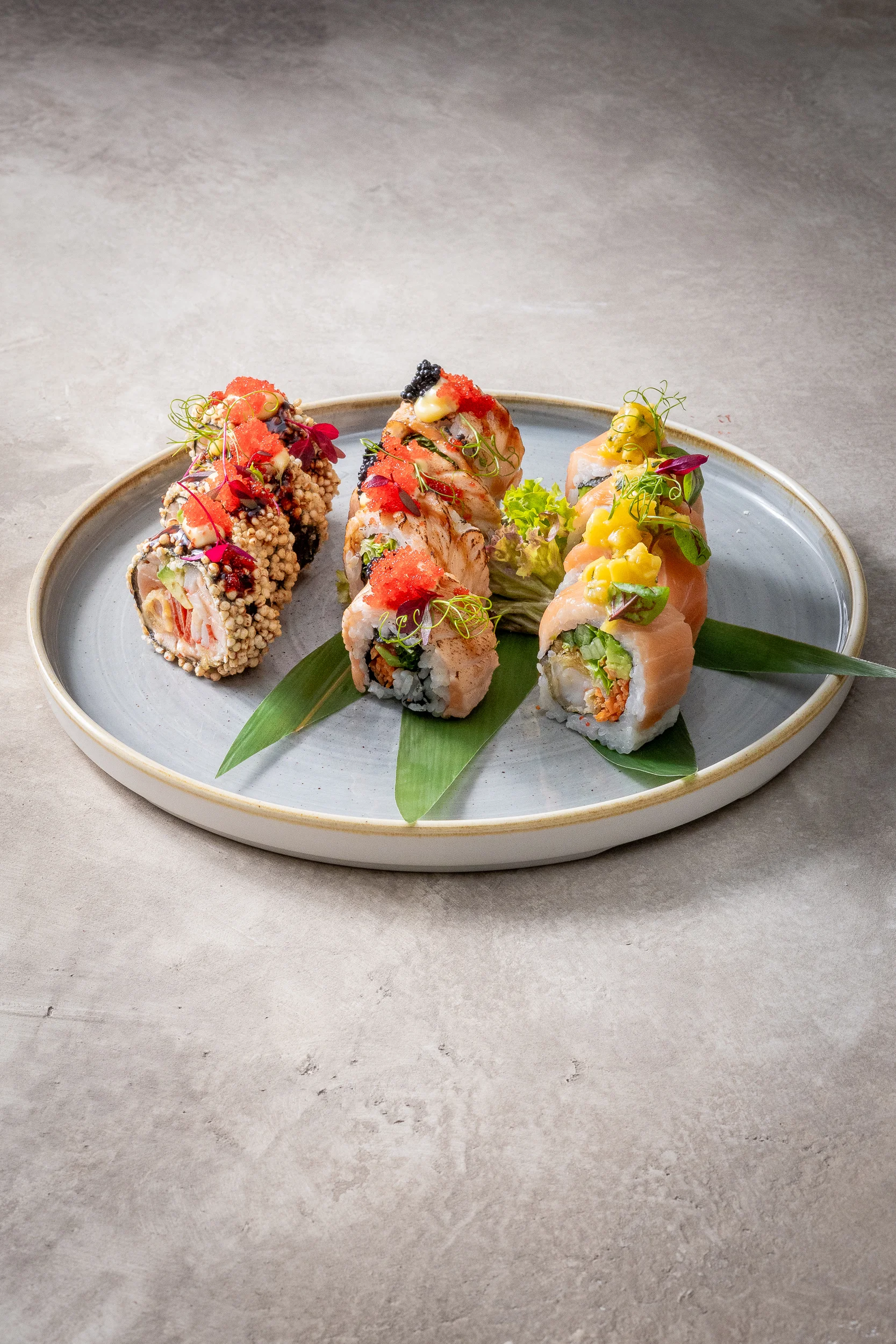 Flaming Sake: grillezett lazac, saláta, avokádó, snidling, sült paprika, répa, teriyaki, japán majonéz, masago és szarvasgomba kaviár / Exotic Dream: lazac, bundázott garnéla, avokádó, uborka, répa, saláta, mangó salsa / Okima Tempura: sült tekercs: lazac, bundázott garnéla, surimi, sült paprika, avokádó, masago, teriyaki, japán majonéz