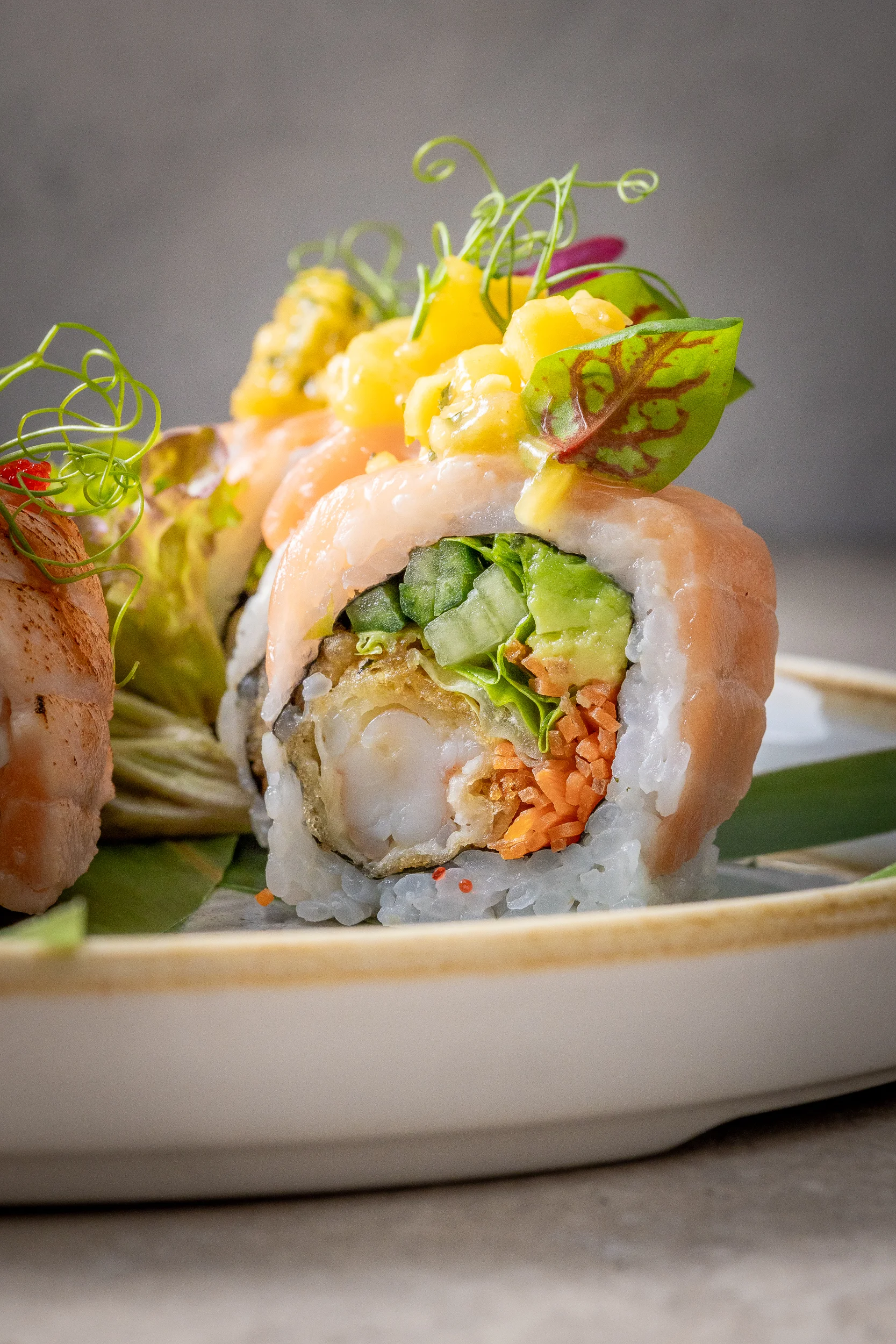 Salmon, tempura shrimp, avocado, cucumber, carrot, salad and mango salsa