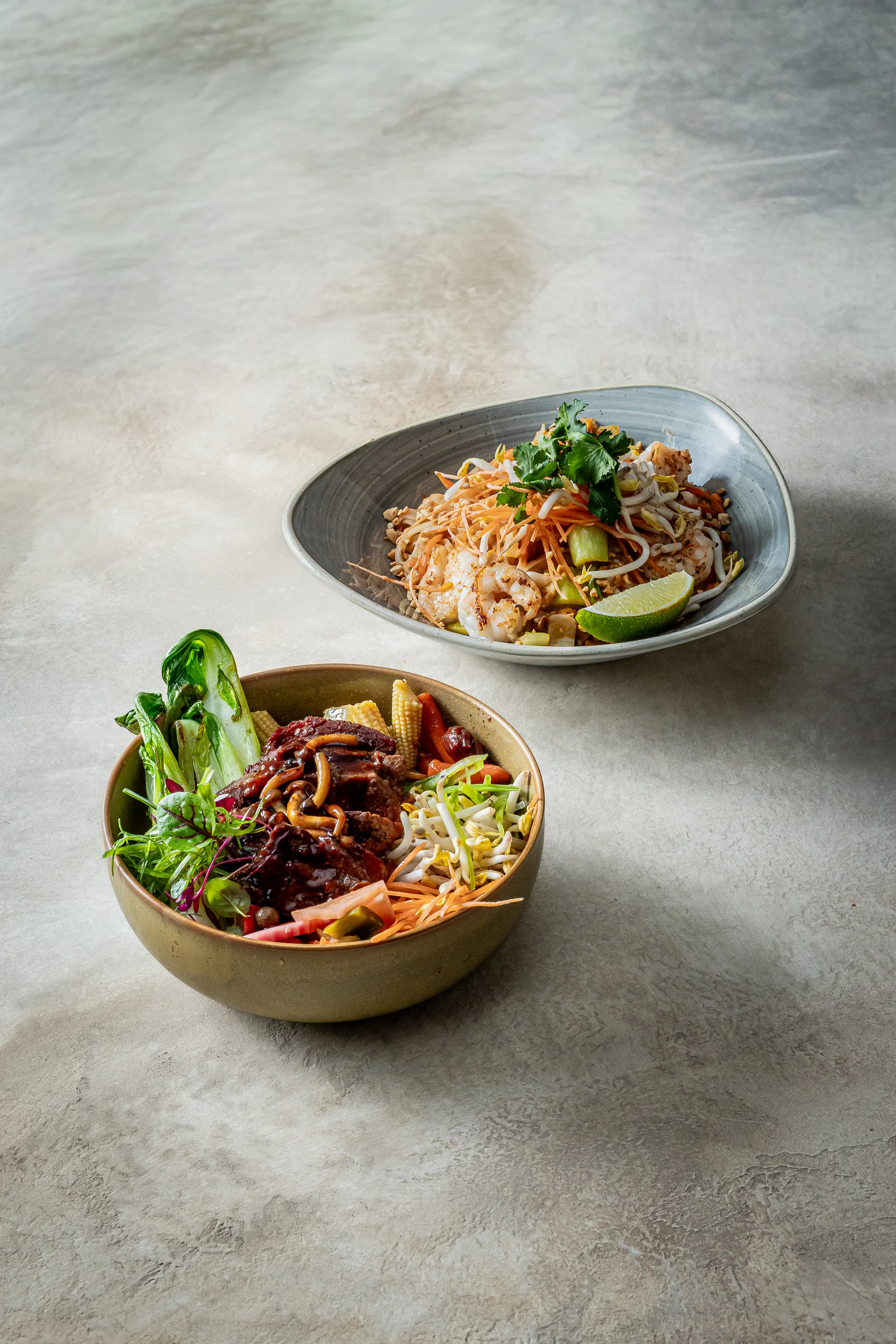 Coconut milk and red curry base with baby corn, mung bean sprouts, shimeji mushrooms, spring onion, coriander, lime and Chinese noodles