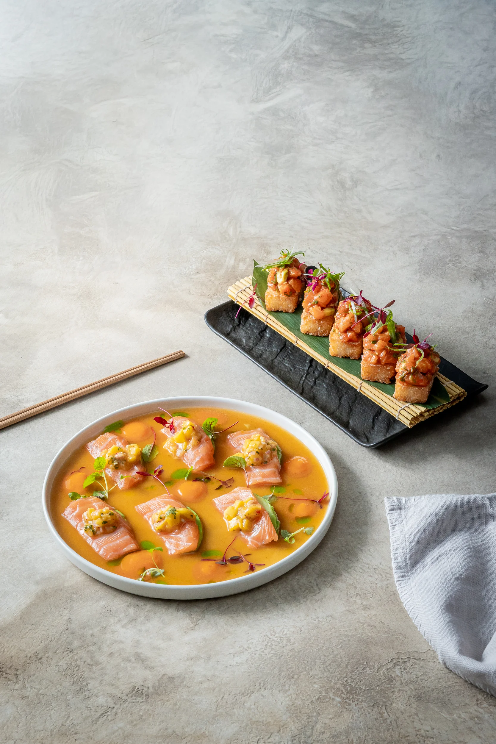 Vékony halszeletek, yuzus zöldalmás-ponzu szósszal és házi mangó salsával)