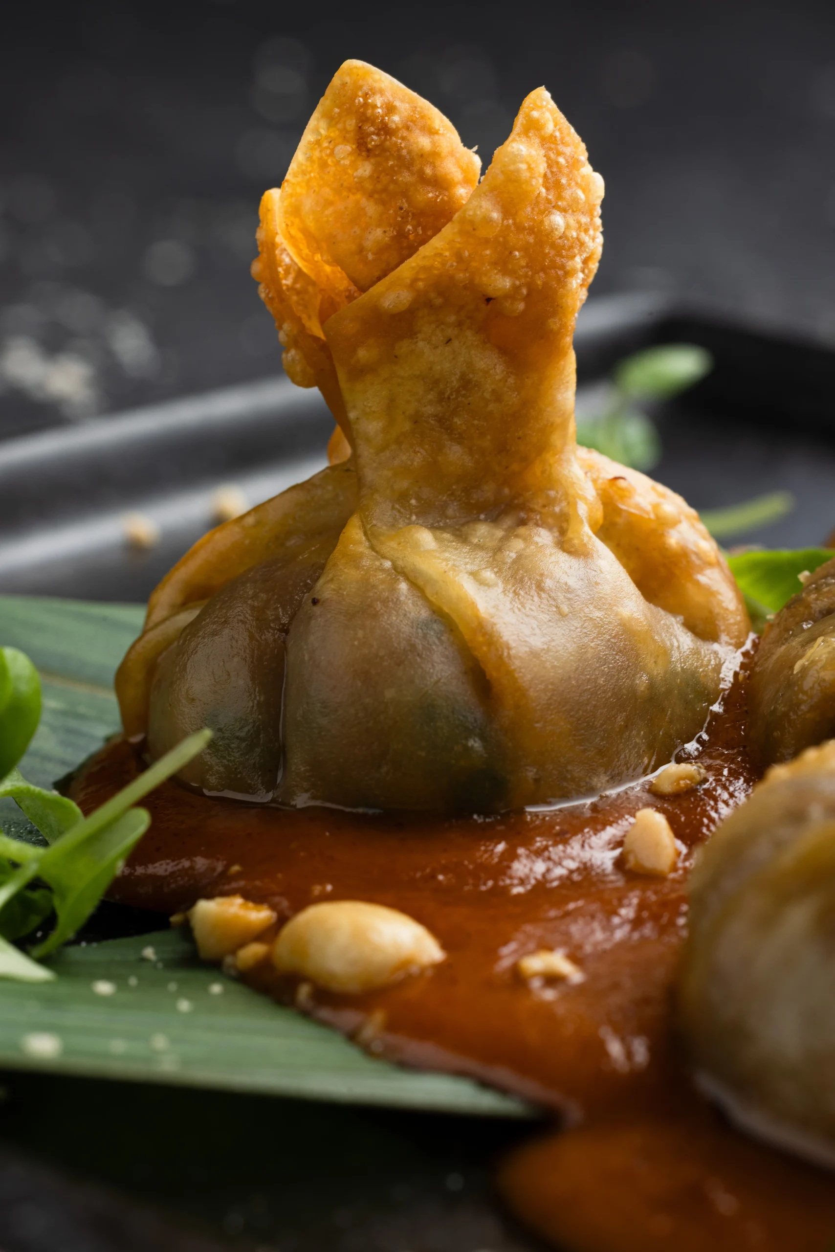 fűszeres marhával töltött sült tészta, chilis mogyorós szósszal