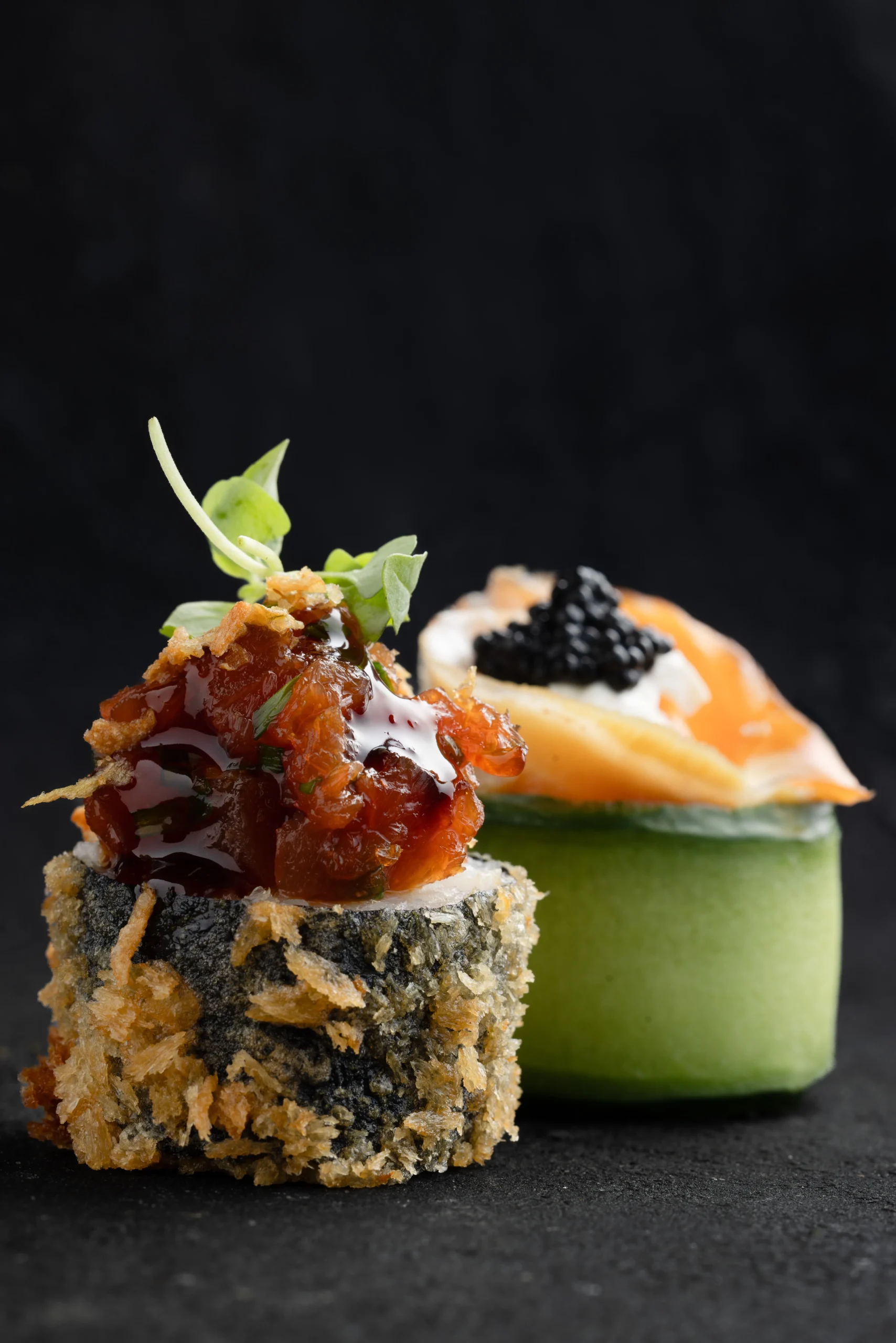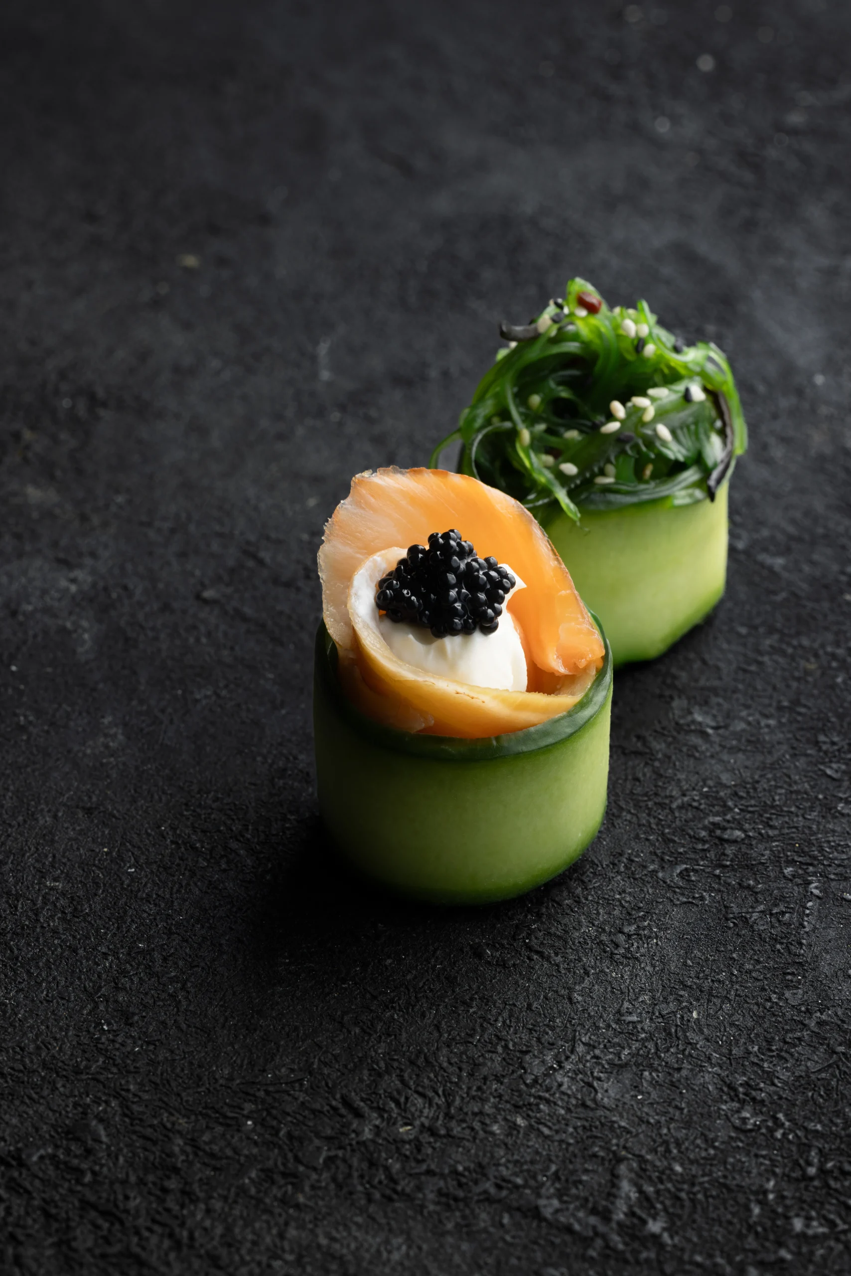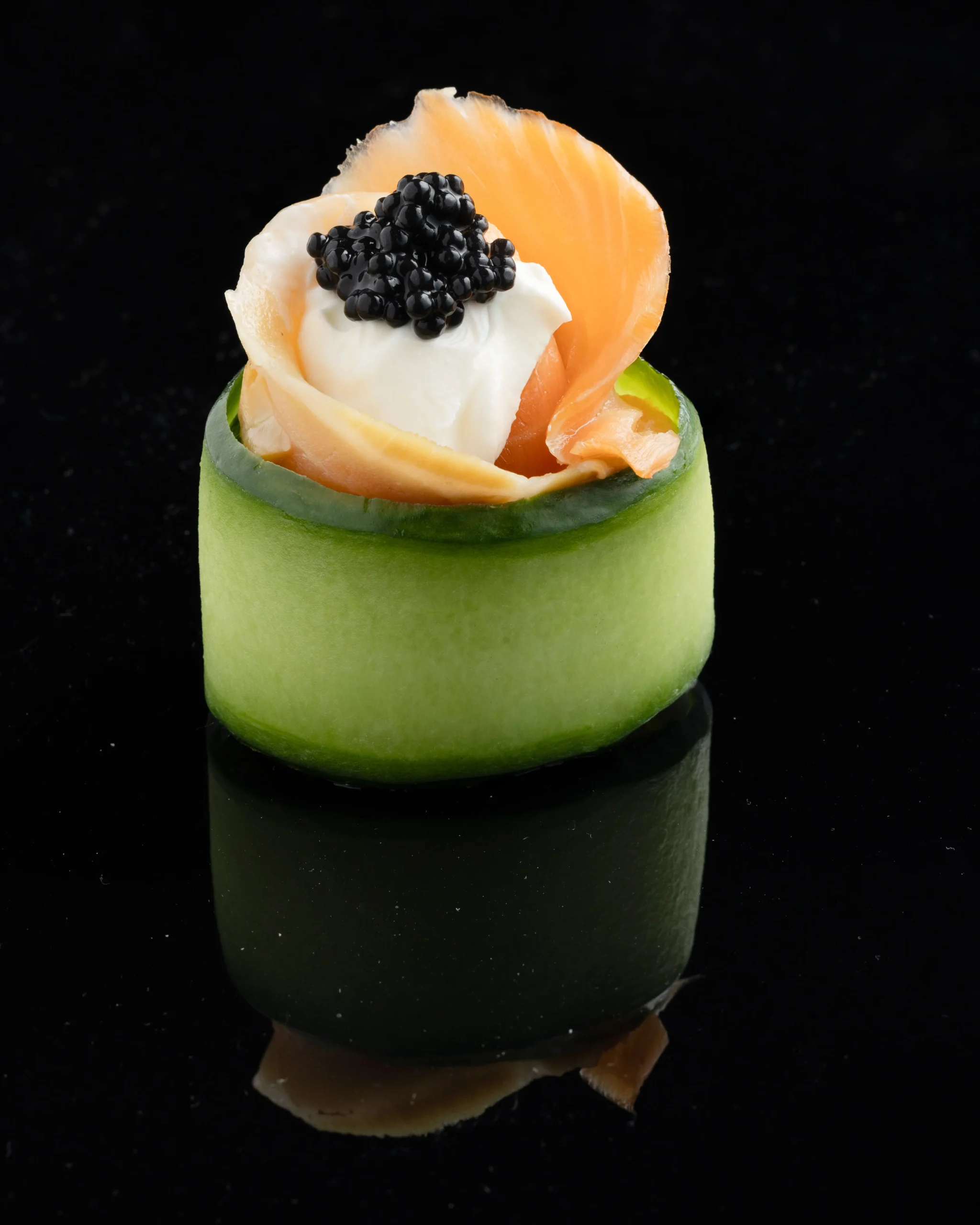 lazac,füstölt lazac,sajtkrém,uborka,zöldspárga,japán majonéz,szarvasgomba kaviár