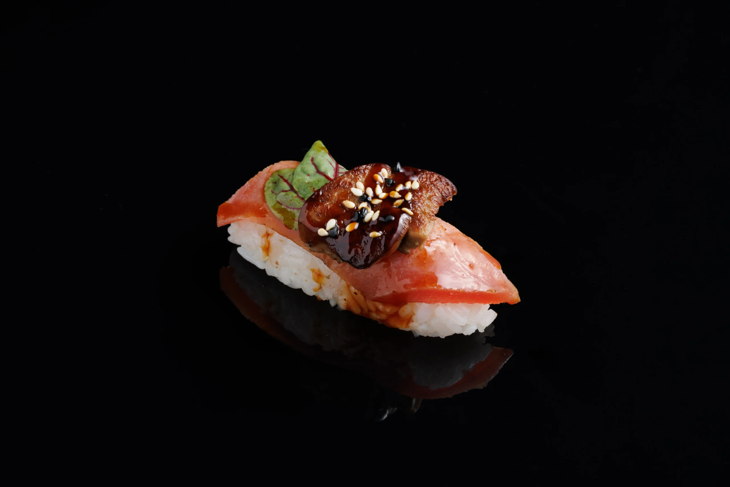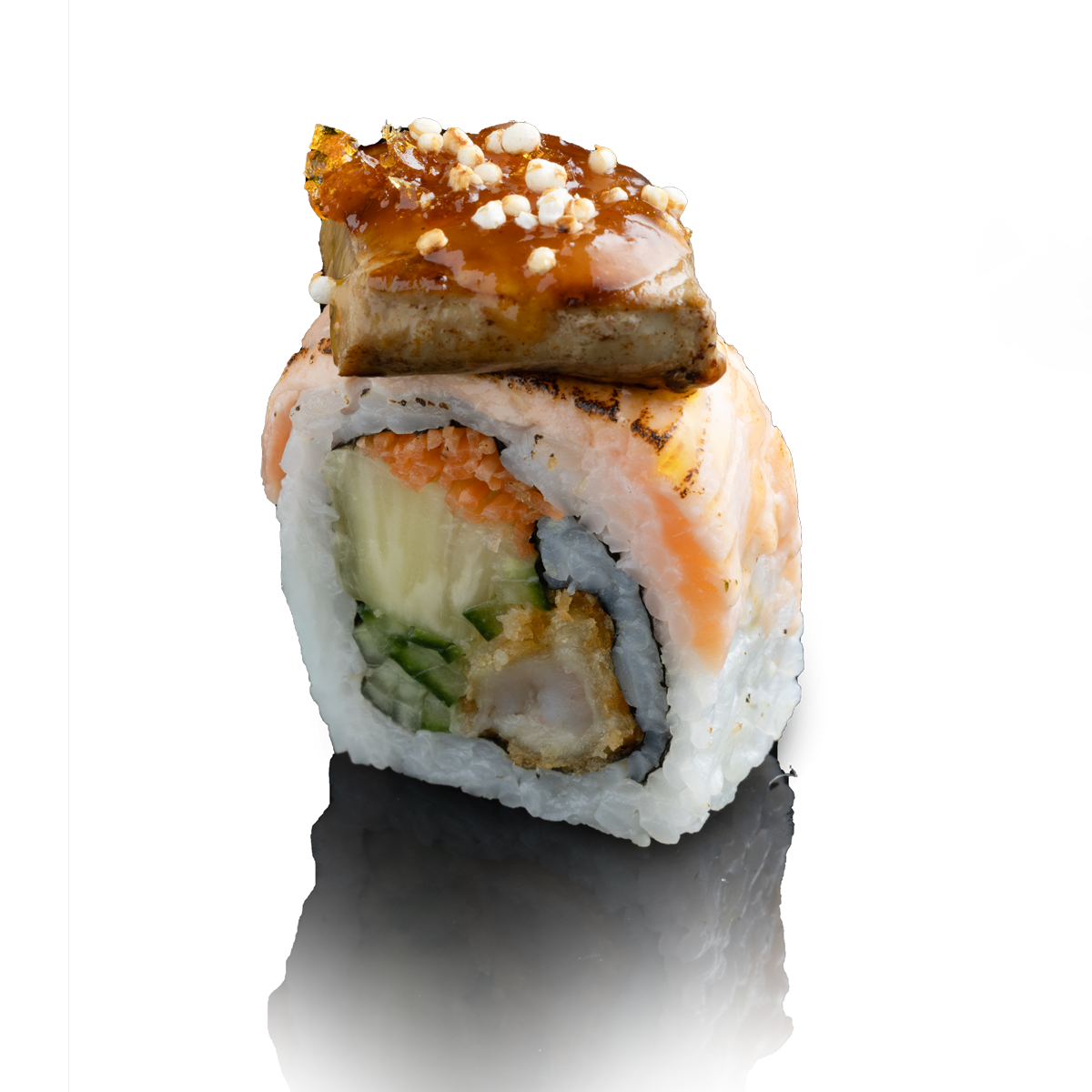 Salmon, avocado, cucumber, grilled beetroot, seared salmon topping, salmon roe, teriyaki
