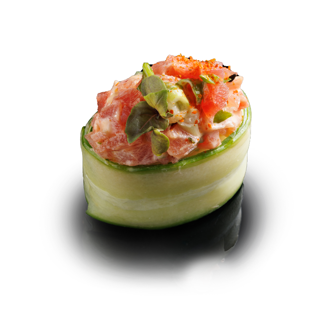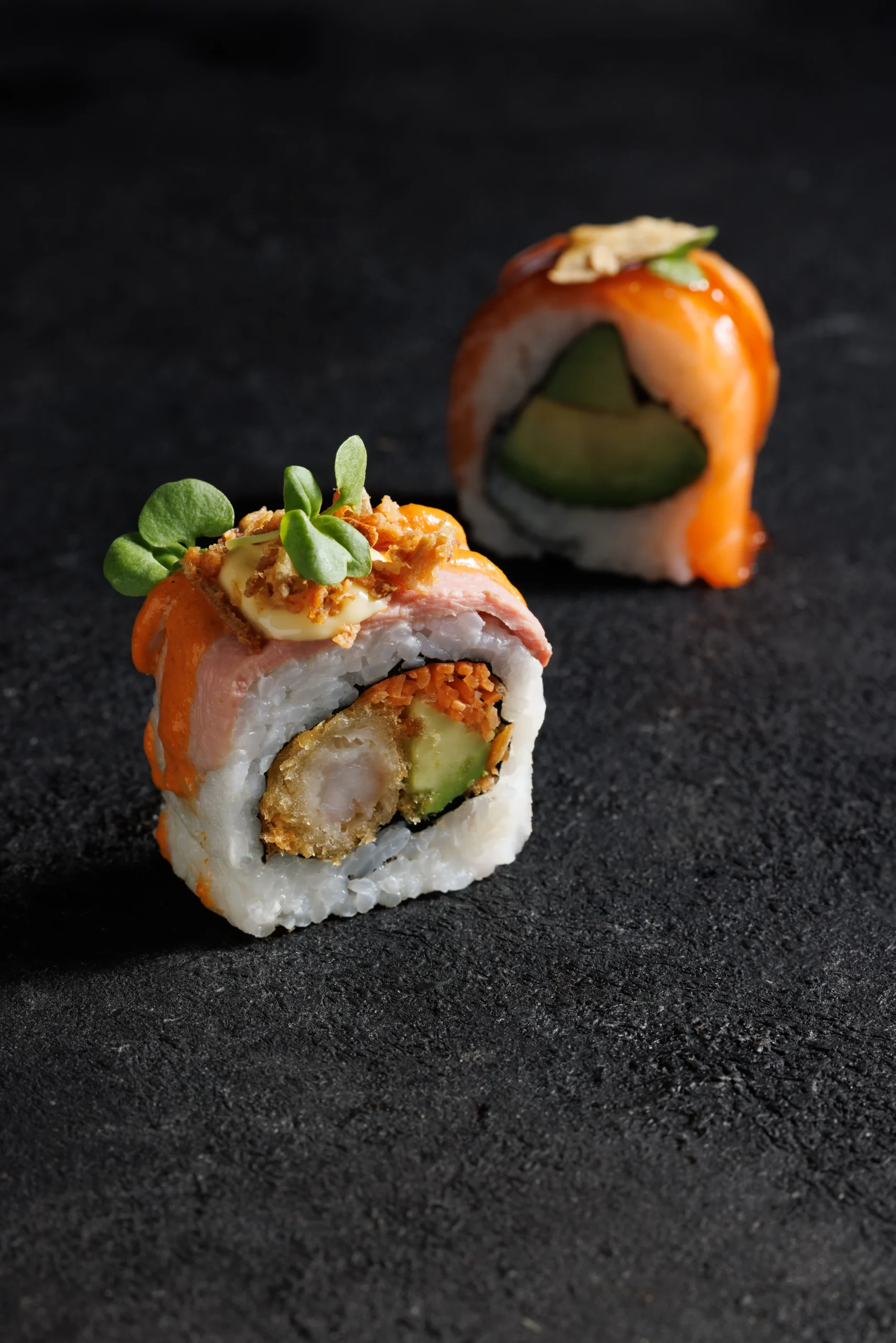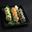 tonhal,lazac,rák tempura,uborka,répa,avokádó,chili szósz,teriyaki,mizuna