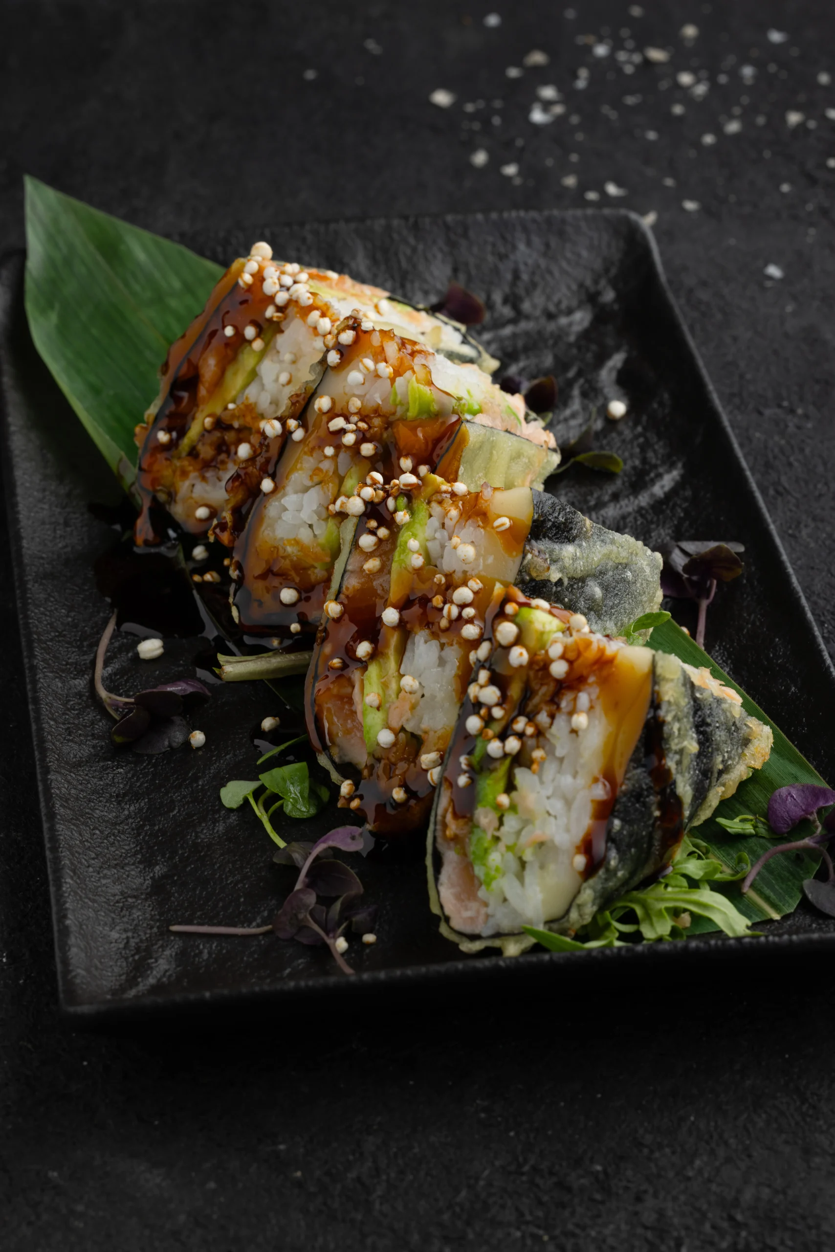 Tuna, salmon, shrimp tempura, cucumber, carrot, avocado, chili sauce, teriyaki, mizuna