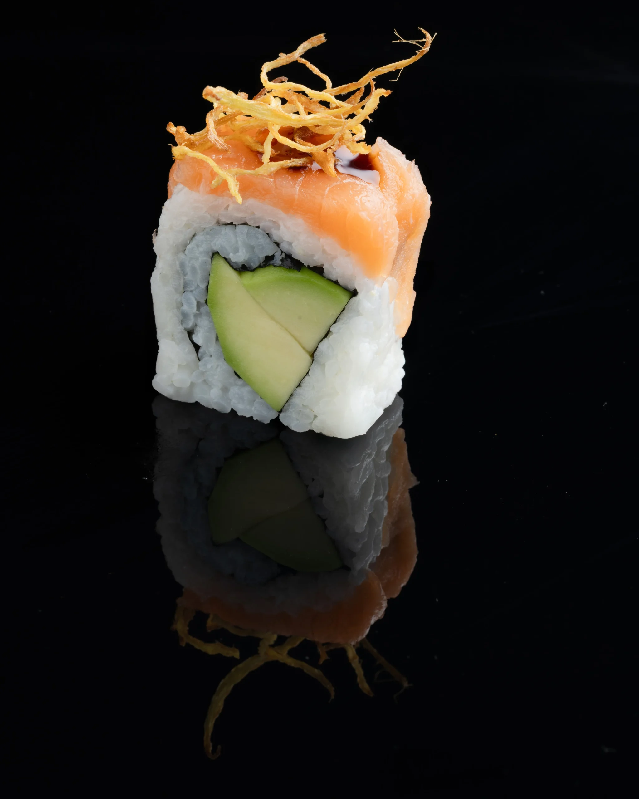 Salmon, cheese, avocado, tempura-fried, sweet soy, puffed quinoa