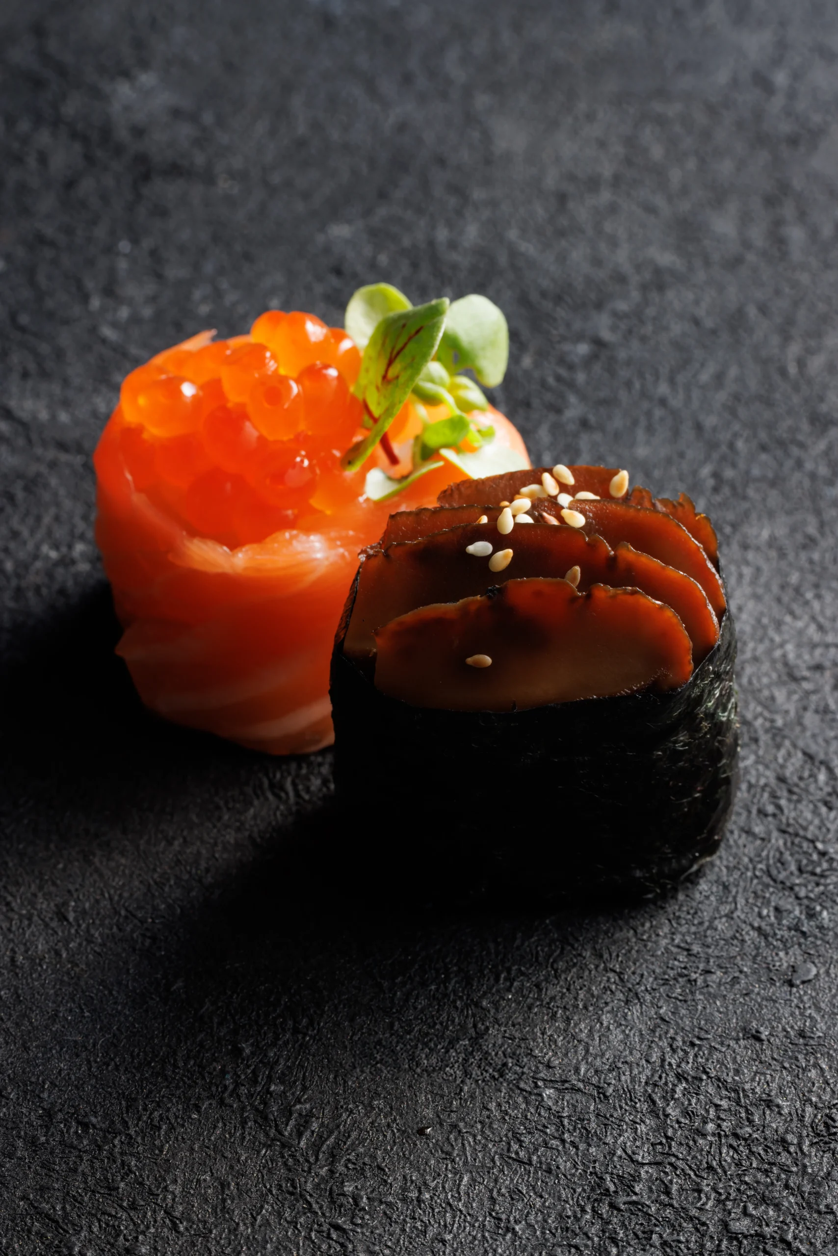 Lazac, avokádó, uborka, sült cékla, perzselt lazac borítás, lazackaviár, teriyaki.