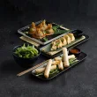 Bundázott garnéla, tonhal, avokádó, uborka, sült paprika, chili szósz, puffasztott vadrizs.