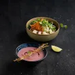 Füstölt lazac, sült cékla, marinált paprika, répa, lazac borítás, mangó chutney, teriyaki, ropogós hagyma.