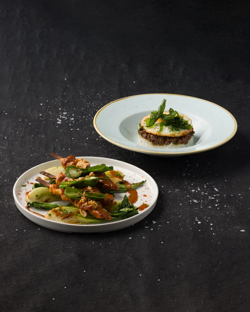 Charcoal-grilled chicken skewers with chili peanut sauce, grilled pak choi, and padron peppers